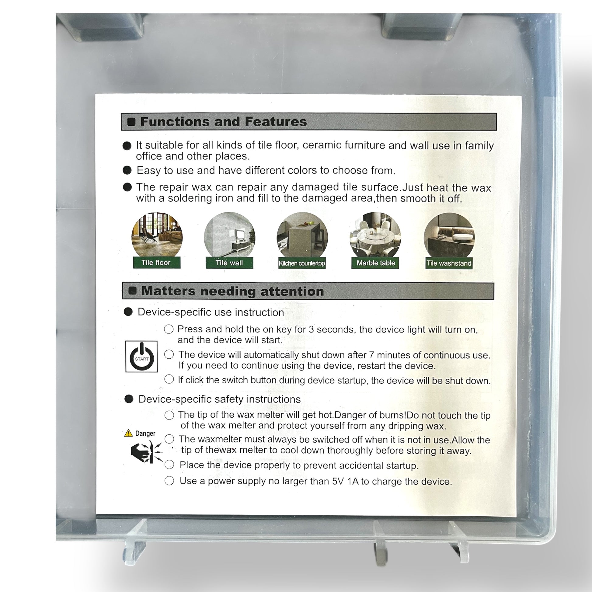 Mit diesem Komplettset können Sie ganz einfach kleine Einschläge oder Absplitterungen auf Fliesen, Fayence, Marmor, Steinzeug, Arbeitsplatten oder Wänden aus Keramik ausbessern.