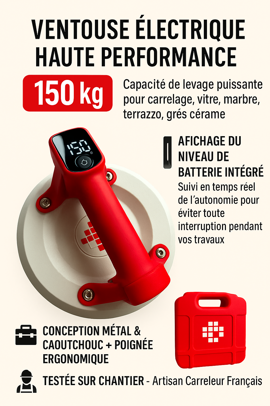 Entdecken Sie unsere leistungsstarke elektrische Digitalsaugvorrichtung, entwickelt für die Anforderungen von Bauprofis und anspruchsvollen Heimwerkern. Mit ihrem Durchmesser von 20 cm und ihrer Hebekapazität von 150 kg ist sie ideal, um Fliesen, Glas, Marmor, Feinsteinzeug oder Terrazzo sicher zu handhaben.