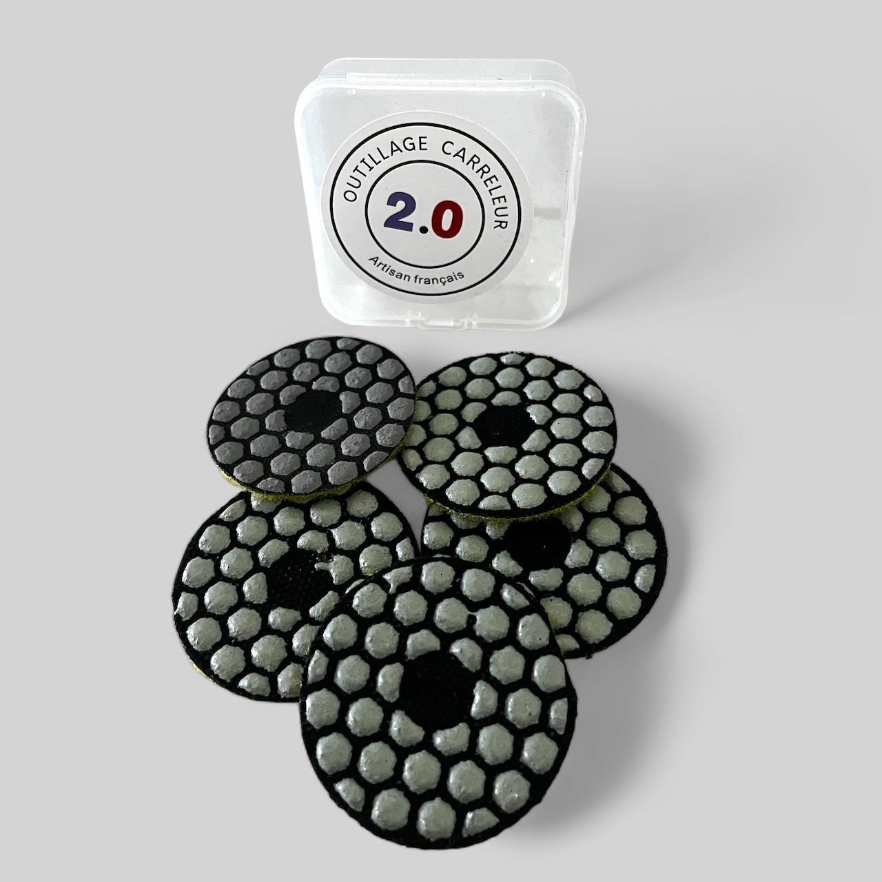 💎 Optimice sus acabados con este pack de 5 mini pads diamantados grano 100! Gracias a su superficie en forma de panal y su revestimiento de diamante, estos discos son perfectos para el lijado intermedio de gres porcelánico, azulejo, mármol, hormigón o incluso granito.
